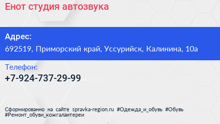 Енот, студия автозвука по адресу 692519, Приморский край, Уссурийск, Калинина, 10а в дальнейшем Организация, размещена в следующих категориях: