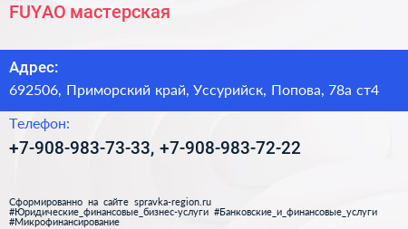 FUYAO, мастерская по адресу 692506, Приморский край, Уссурийск, Попова, 78а ст4 в дальнейшем Организация, размещена в следующих категориях: