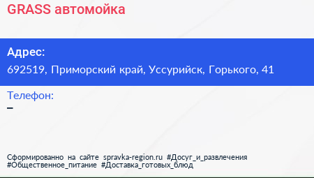 GRASS, автомойка по адресу 692519, Приморский край, Уссурийск, Горького, 41 в дальнейшем Организация, размещена в следующих категориях: