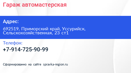 Гараж, автомастерская по адресу 692519, Приморский край, Уссурийск, Сельскохозяйственная, 23 ст1 в дальнейшем Организация, размещена в следующих категориях:
