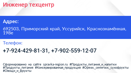 Инженер, техцентр по адресу 692503, Приморский край, Уссурийск, Краснознамённая, 198е в дальнейшем Организация, размещена в следующих категориях: