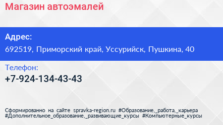 Магазин автоэмалей по адресу 692519, Приморский край, Уссурийск, Пушкина, 40 в дальнейшем Организация, размещена в следующих категориях: