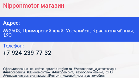 Nipponmotor, магазин по адресу 692503, Приморский край, Уссурийск, Краснознамённая, 190 в дальнейшем Организация, размещена в следующих категориях: