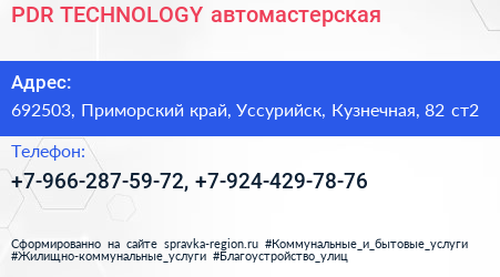 PDR TECHNOLOGY, автомастерская по адресу 692503, Приморский край, Уссурийск, Кузнечная, 82 ст2 в дальнейшем Организация, размещена в следующих категориях: