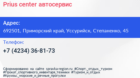 Prius center, автосервис по адресу 692501, Приморский край, Уссурийск, Степаненко, 45 в дальнейшем Организация, размещена в следующих категориях: