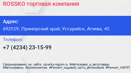 ROSSKO, торговая компания по адресу 692519, Приморский край, Уссурийск, Агеева, 45 в дальнейшем Организация, размещена в следующих категориях: