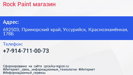 Rock Paint, магазин по адресу 692503, Приморский край, Уссурийск, Краснознамённая, 178Б в дальнейшем Организация, размещена в следующих категориях: