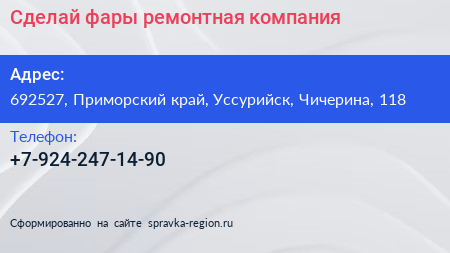 Сделай фары, ремонтная компания по адресу 692527, Приморский край, Уссурийск, Чичерина, 118 в дальнейшем Организация, размещена в следующих категориях: