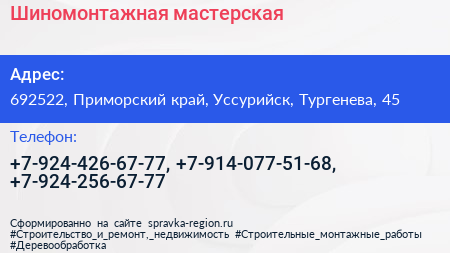 Шиномонтажная мастерская по адресу 692522, Приморский край, Уссурийск, Тургенева, 45 в дальнейшем Организация, размещена в следующих категориях: