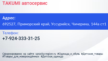 TAKUMI, автосервис по адресу 692527, Приморский край, Уссурийск, Чичерина, 144а ст1 в дальнейшем Организация, размещена в следующих категориях:
