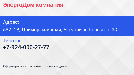 ЭнергоДом, компания по адресу 692519, Приморский край, Уссурийск, Горького, 33 в дальнейшем Организация, размещена в следующих категориях: