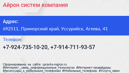 Айрон систем, компания по адресу 692511, Приморский край, Уссурийск, Агеева, 41 в дальнейшем Организация, размещена в следующих категориях: