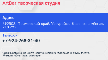 ArtBar, творческая студия по адресу 692503, Приморский край, Уссурийск, Краснознамённая, 218 ст2 в дальнейшем Организация, размещена в следующих категориях: