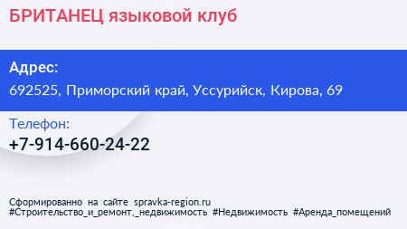 БРИТАНЕЦ, языковой клуб по адресу 692525, Приморский край, Уссурийск, Кирова, 69 в дальнейшем Организация, размещена в следующих категориях: