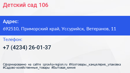 Детский сад №106 по адресу 692510, Приморский край, Уссурийск, Ветеранов, 11 в дальнейшем Организация, размещена в следующих категориях: