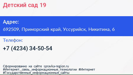 Детский сад №19 по адресу 692509, Приморский край, Уссурийск, Никитина, 6 в дальнейшем Организация, размещена в следующих категориях: