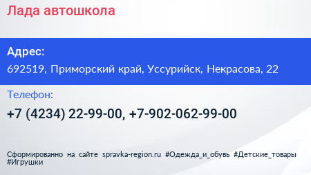 Лада, автошкола по адресу 692519, Приморский край, Уссурийск, Некрасова, 22 в дальнейшем Организация, размещена в следующих категориях: