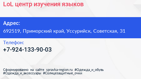 LoL, центр изучения языков по адресу 692519, Приморский край, Уссурийск, Советская, 31 в дальнейшем Организация, размещена в следующих категориях: