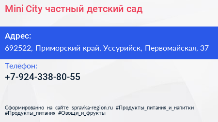 Mini-City, частный детский сад по адресу 692522, Приморский край, Уссурийск, Первомайская, 37 в дальнейшем Организация, размещена в следующих категориях: