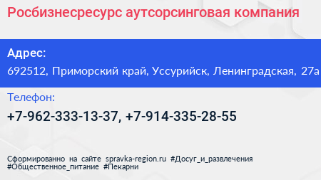Росбизнесресурс, аутсорсинговая компания по адресу 692512, Приморский край, Уссурийск, Ленинградская, 27а в дальнейшем Организация, размещена в следующих категориях: