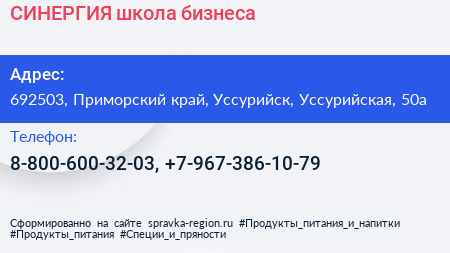 СИНЕРГИЯ, школа бизнеса по адресу 692503, Приморский край, Уссурийск, Уссурийская, 50а в дальнейшем Организация, размещена в следующих категориях: