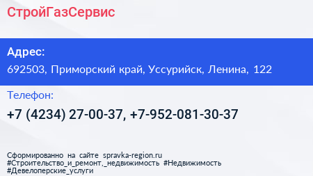 СтройГазСервис по адресу 692503, Приморский край, Уссурийск, Ленина, 122 в дальнейшем Организация, размещена в следующих категориях: