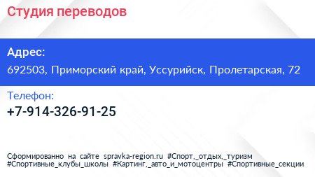 Студия переводов по адресу 692503, Приморский край, Уссурийск, Пролетарская, 72 в дальнейшем Организация, размещена в следующих категориях: