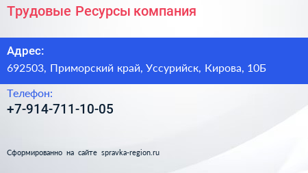 Трудовые Ресурсы, компания по адресу 692503, Приморский край, Уссурийск, Кирова, 10Б в дальнейшем Организация, размещена в следующих категориях: