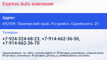 Express Auto, компания по адресу 692509, Приморский край, Уссурийск, Одоевского, 25 в дальнейшем Организация, размещена в следующих категориях: