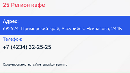 25 Регион, кафе по адресу 692524, Приморский край, Уссурийск, Некрасова, 244Б в дальнейшем Организация, размещена в следующих категориях: