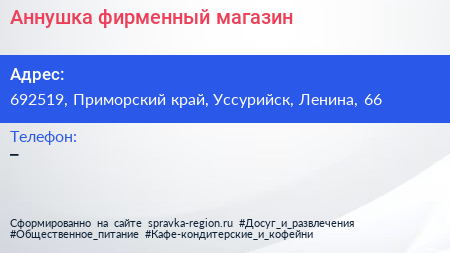 Аннушка, фирменный магазин по адресу 692519, Приморский край, Уссурийск, Ленина, 66 в дальнейшем Организация, размещена в следующих категориях: