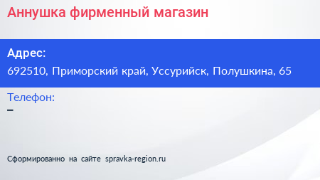 Аннушка, фирменный магазин по адресу 692510, Приморский край, Уссурийск, Полушкина, 65 в дальнейшем Организация, размещена в следующих категориях: