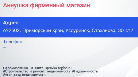 Аннушка, фирменный магазин по адресу 692502, Приморский край, Уссурийск, Стаханова, 30 ст2 в дальнейшем Организация, размещена в следующих категориях:
