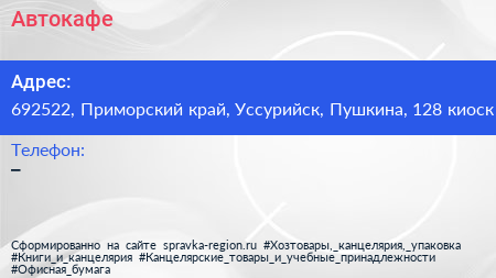 Автокафе по адресу 692522, Приморский край, Уссурийск, Пушкина, 128 киоск в дальнейшем Организация, размещена в следующих категориях: