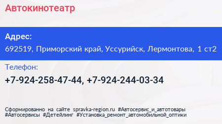 Автокинотеатр по адресу 692519, Приморский край, Уссурийск, Лермонтова, 1 ст2 в дальнейшем Организация, размещена в следующих категориях: