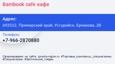 Bambook cafe, кафе по адресу 692512, Приморский край, Уссурийск, Ермакова, 28 в дальнейшем Организация, размещена в следующих категориях: