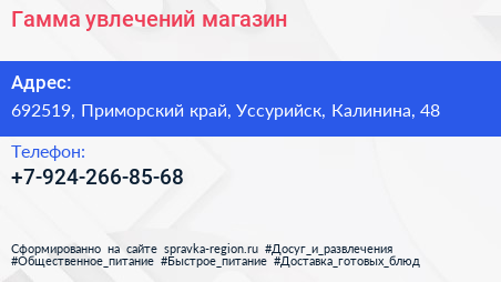 Гамма увлечений, магазин по адресу 692519, Приморский край, Уссурийск, Калинина, 48 в дальнейшем Организация, размещена в следующих категориях: