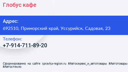 Глобус, кафе по адресу 692510, Приморский край, Уссурийск, Садовая, 23 в дальнейшем Организация, размещена в следующих категориях: