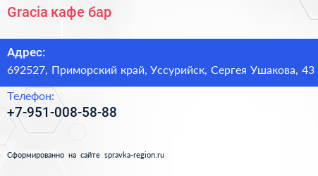 Gracia, кафе-бар по адресу 692527, Приморский край, Уссурийск, Сергея Ушакова, 43 в дальнейшем Организация, размещена в следующих категориях:
