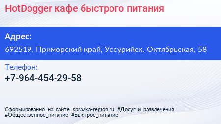 HotDogger, кафе быстрого питания по адресу 692519, Приморский край, Уссурийск, Октябрьская, 58 в дальнейшем Организация, размещена в следующих категориях: