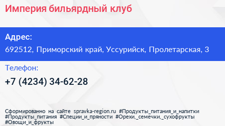 Империя, бильярдный клуб по адресу 692512, Приморский край, Уссурийск, Пролетарская, 3 в дальнейшем Организация, размещена в следующих категориях: