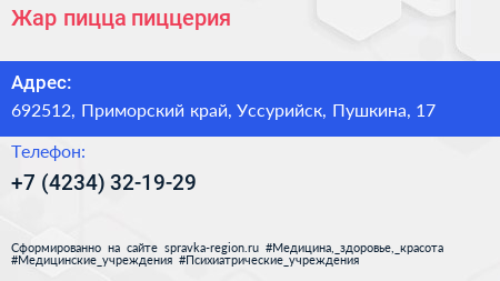 Жар-пицца, пиццерия по адресу 692512, Приморский край, Уссурийск, Пушкина, 17 в дальнейшем Организация, размещена в следующих категориях: