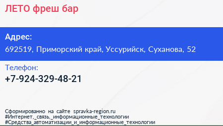 ЛЕТО, фреш-бар по адресу 692519, Приморский край, Уссурийск, Суханова, 52 в дальнейшем Организация, размещена в следующих категориях: