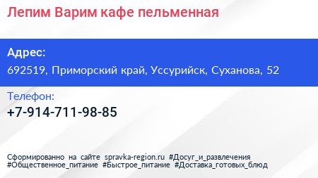 Лепим Варим, кафе-пельменная по адресу 692519, Приморский край, Уссурийск, Суханова, 52 в дальнейшем Организация, размещена в следующих категориях: