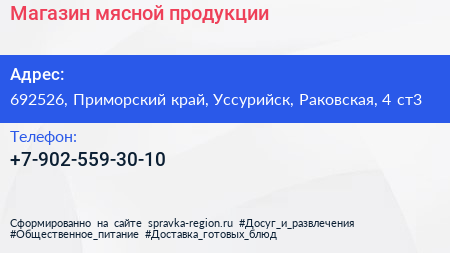 Магазин мясной продукции по адресу 692526, Приморский край, Уссурийск, Раковская, 4 ст3 в дальнейшем Организация, размещена в следующих категориях: