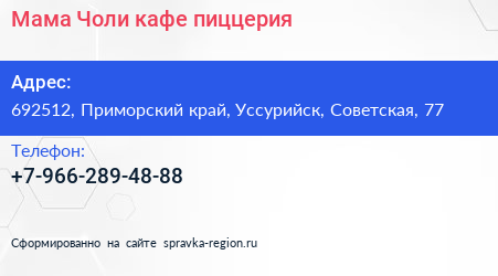 Мама Чоли, кафе-пиццерия по адресу 692512, Приморский край, Уссурийск, Советская, 77 в дальнейшем Организация, размещена в следующих категориях: