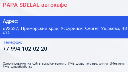 PAPA SDELAL, автокафе по адресу 692527, Приморский край, Уссурийск, Сергея Ушакова, 43 ст1 в дальнейшем Организация, размещена в следующих категориях:
