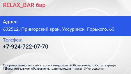 RELAX_BAR, бар по адресу 692512, Приморский край, Уссурийск, Горького, 60 в дальнейшем Организация, размещена в следующих категориях: