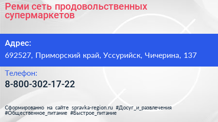 Реми, сеть продовольственных супермаркетов по адресу 692527, Приморский край, Уссурийск, Чичерина, 137 в дальнейшем Организация, размещена в следующих категориях: