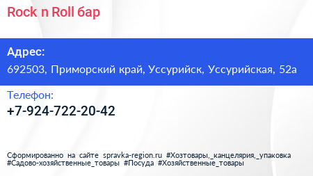 Rock n Roll, бар по адресу 692503, Приморский край, Уссурийск, Уссурийская, 52а в дальнейшем Организация, размещена в следующих категориях: